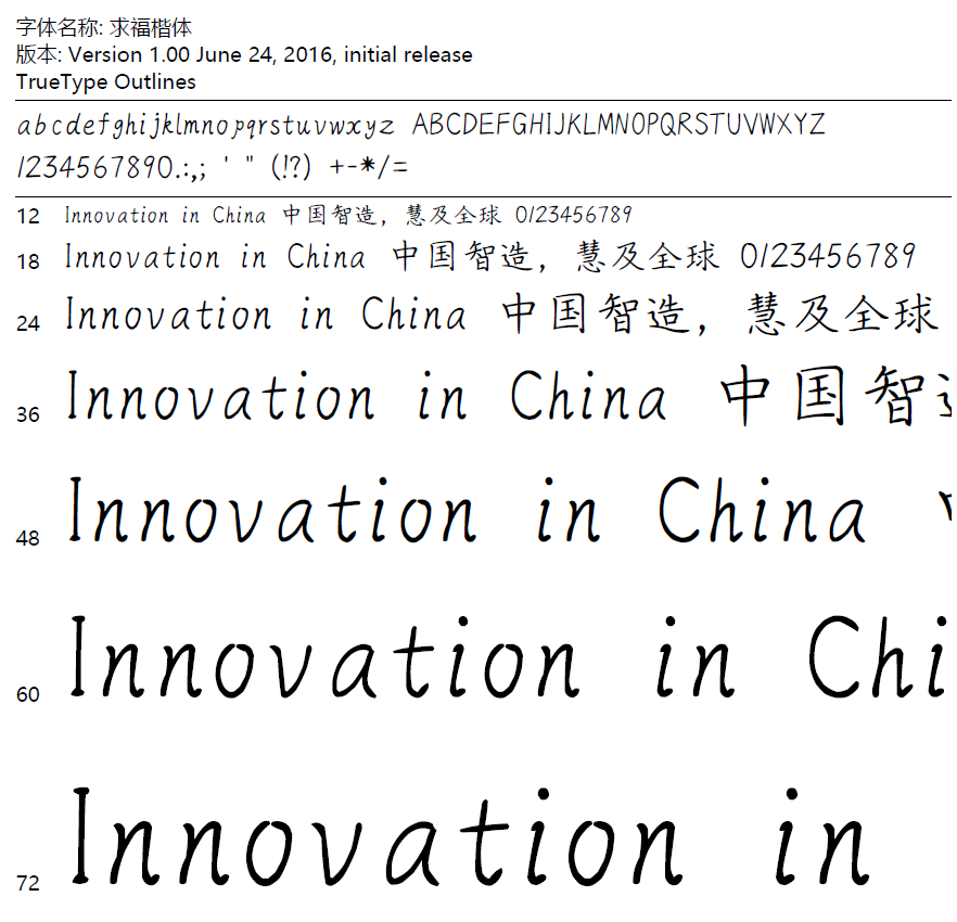 字体名称: 求福楷体 版本: Version 1.00 June 24, 2016, initial release TrueType Outlines