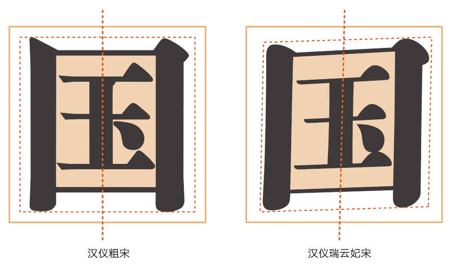 汉仪瑞云妃宋的整体结构取右倾斜势,字面为不平行四边形,左右竖线及上下横线的倾角均不平行,右侧竖线和底部横线角度取向平缓,使得整体字形具有书写动感。