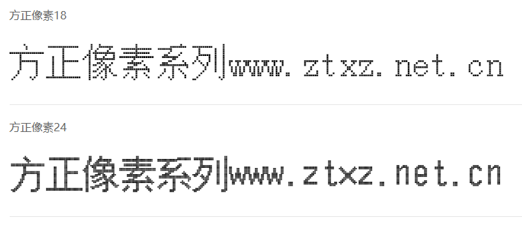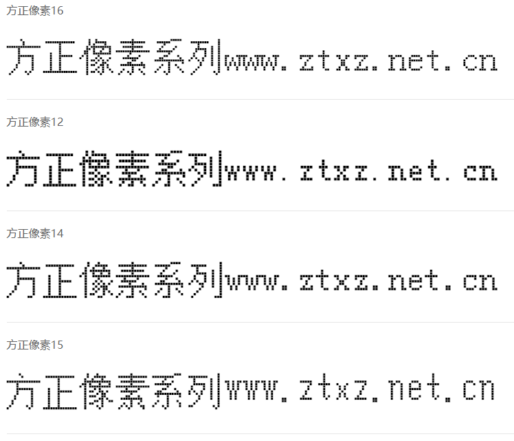 方正像素是一款用于电子屏幕的功能性字体。这款字体基于黑体和宋体的基本字形,每个字的像素颗粒由手工设定,在保证易识性和美观性的同时满足屏幕设备上的点阵数量。方正像素家族包含6款字体,其中数字代表最长边的点阵数,适用于LED屏和针式打印机等设备。此外,小字号的方正像素具有一定的易读性,还可在传统印刷媒介中用于机械和科技类的文本。