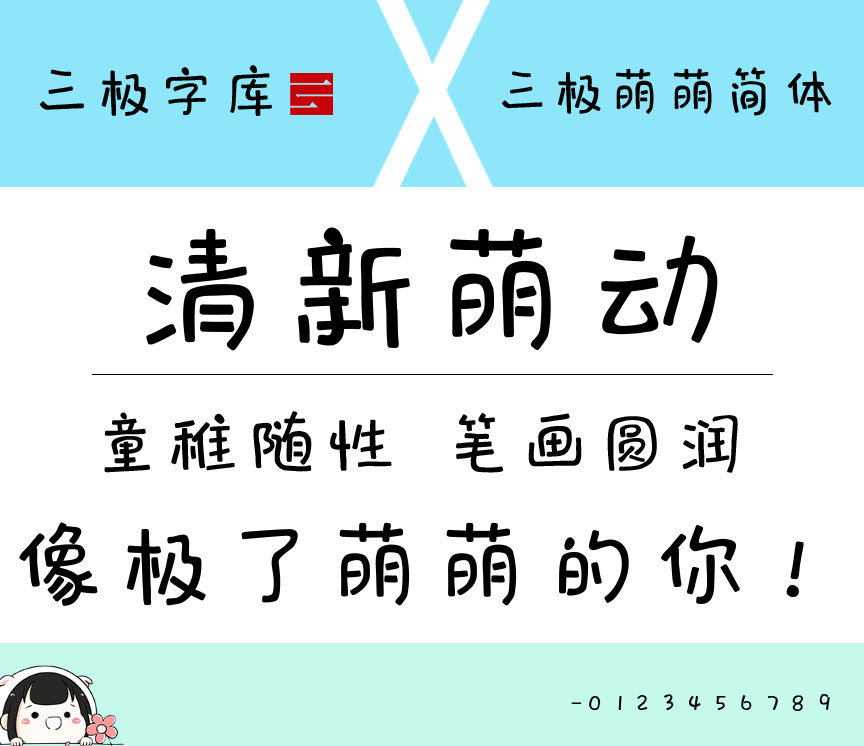 三极萌萌简体以儿童写字的特点,勾勒笔画,具有童稚之情。笔画圆润,字形轮廓统一,灵动可爱,溢于画笔,清新萌动。适用少儿类读物、书刊以及社交网络个性化用字。
