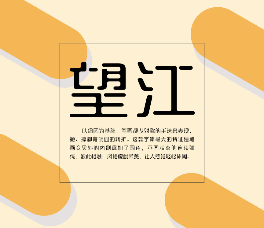 三极望江简体的设计是以细圆为基础,笔画都以对称的手法来表现,撇、捺都有明显的转折。这款字体最大的特征是笔画交叉处的内侧添加了圆角,不同状态的连续弧线,彼此相融,风格朦胧柔美,让人感觉轻松休闲,适用于品牌广告和产品包装的设计。