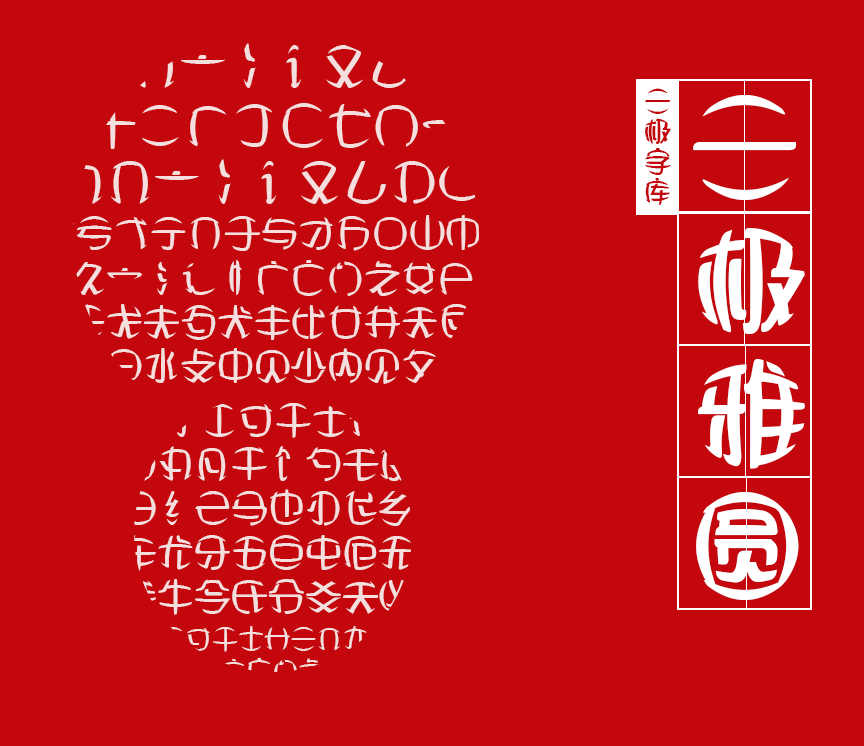 三极浑圆简体其设计与常规字不同,整体结构成圆弧形,字形结构相对圆润有趣,其字体寓意为雅趣圆满,富有哲理。适用媒介:杂志、书籍、广告、标志、宣传册、包装、影视、动漫、屏幕显示、交互设计。