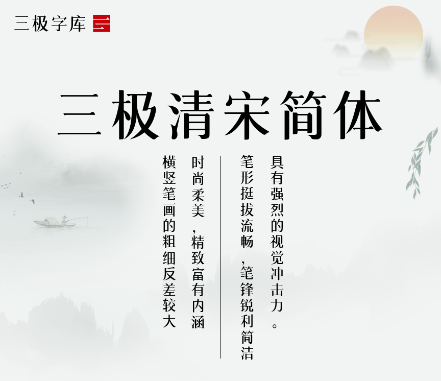 三极清宋简体是一款家族字体,其字形清新,布白均匀,字形结构饱满匀称、柔美,中宫偏大,笔形挺拔流畅,笔锋锐利简洁。撇、捺起笔收笔统一,个性鲜明,富有朝气。这款字的整体风格清新醒目、时尚柔美,精致富有内涵。横竖笔画的粗细反差较大,具有强烈的视觉冲击力。不但适用于各类传统纸媒,还可直接用于屏幕阅读。适用于传统印刷媒介的标题与正文排版。以及广告、标志和产品包装设计。