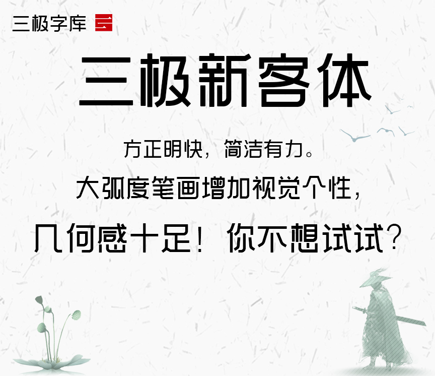 三极新客体是是一款几何感十足的创意字体。其笔画多以对称的手法来表现,撇、捺都有明显的几何转折,不同于书写状态的连续弧线。起笔收笔都为圆角,字体更加精致,使字体刚中带柔。使用了大弧度笔画加强了字体特有的视觉个性。字形方正明快,简洁有力,适用于书刊封面、广告品牌、产品包装设计及空间导视应用。