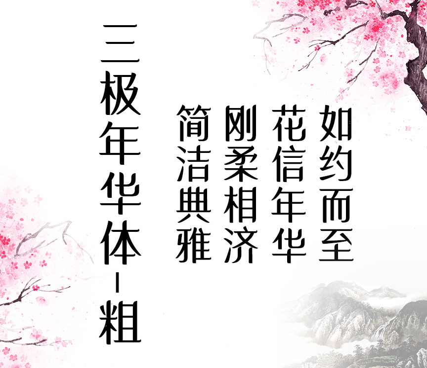 三极年华体是具有典雅气质的风格化黑体作品。兼具了黑体的简洁和宋体的雅致特征。 整体字形方正,刚柔相济,优雅大方。其横竖笔画横纵,横竖笔画粗细反差较大,加以弯钩柔美曲线点缀,突显典雅之风格。适用用于商业广告、书刊出版、产品包装及界面设计标题,店招牌匾。