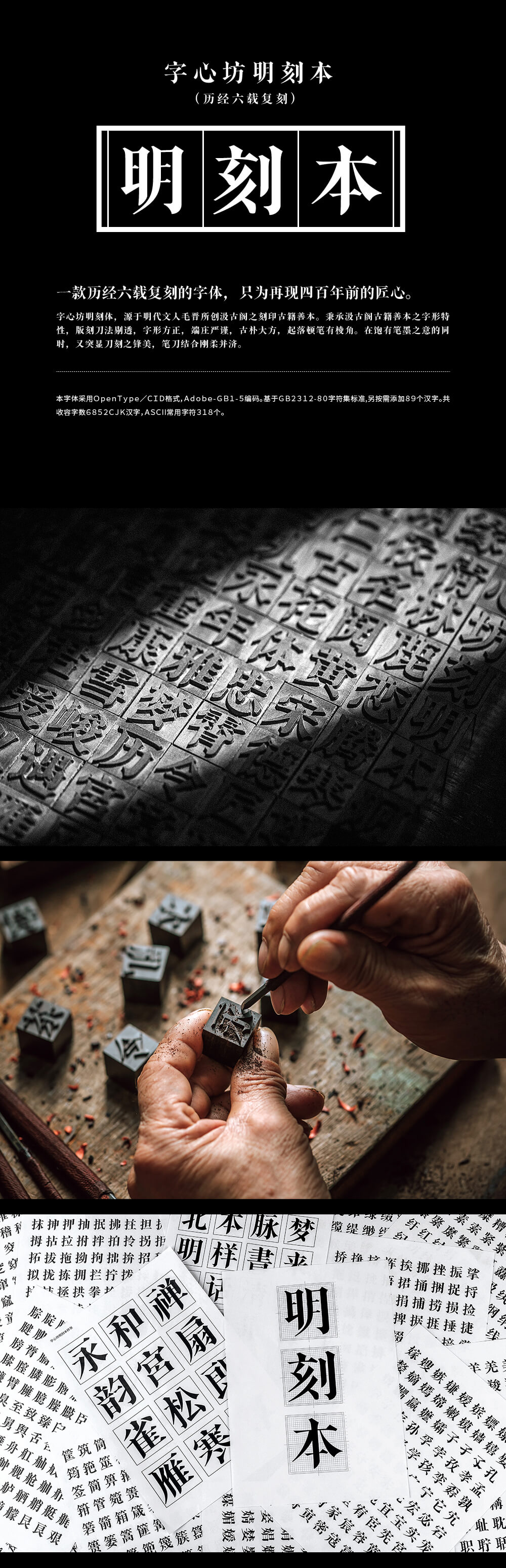 字心坊明刻体,源于明代常熟文人毛晋创办的汲古阁的刻印古籍善本。秉承汲古阁古籍善本之字形特性,版刻刀法剔透,字形方正,端庄严谨,古朴大方,起落顿笔有棱角。在饱有笔墨之意的同时,又突显刀刻之锋美,笔刀结合刚柔并济。
