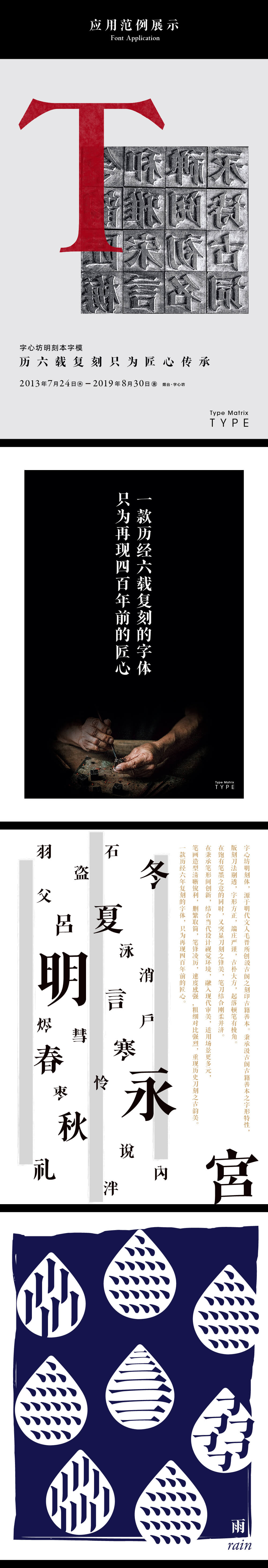 在秉承笔形间创新,结合当代设计视觉环境,融入现代审美,适用场景更多元,笔画造型清晰锐利,删繁取简,笔锋凌厉,速度感强,粗细对比强烈,重现刀刻古韵之美。在计算机现代化的时代,穿越四百个春秋,让古籍刻本之美再现在当代数字的时空中,让文字的古韵之美与现代时尚完美融合!