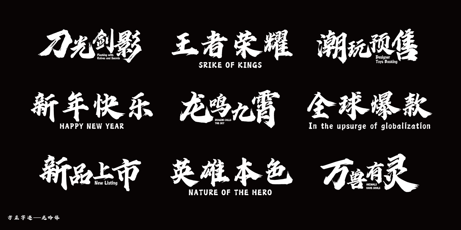 方正字迹-龙吟体笔画刚硬锐利,笔触狂放,字形浑厚洒脱,且结构多变。不仅适用于横向、纵向的排版,还方便了字与字之间的穿插。在继承传统的同时又融入当今商业化的应用,适合于电影海报、包装、品牌名称、各类商业海报、户外广告标题等。