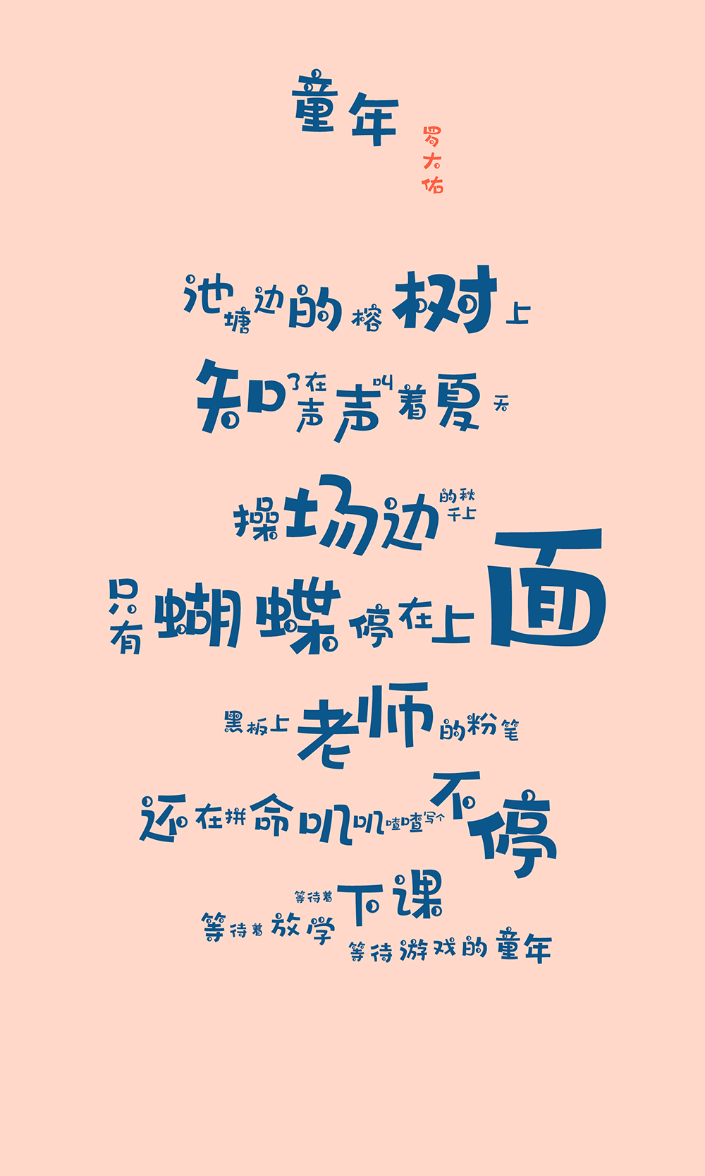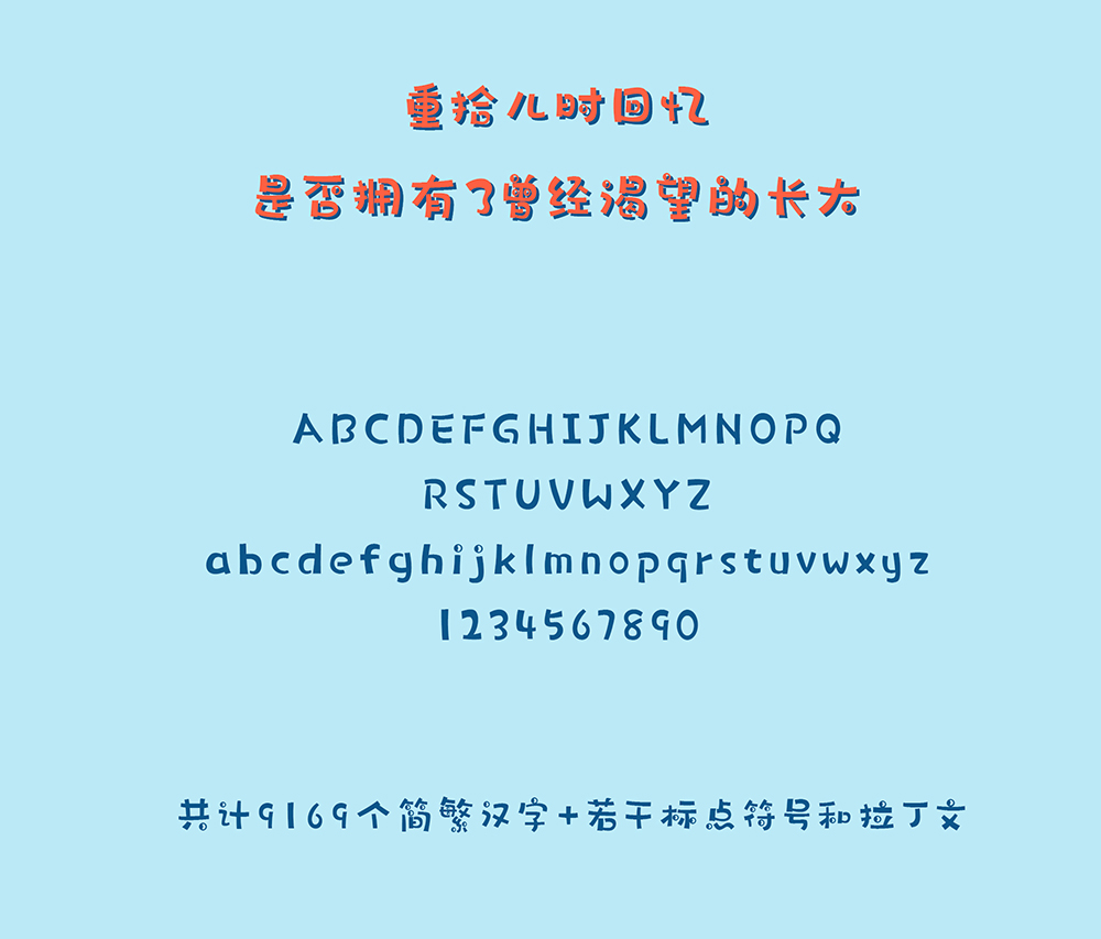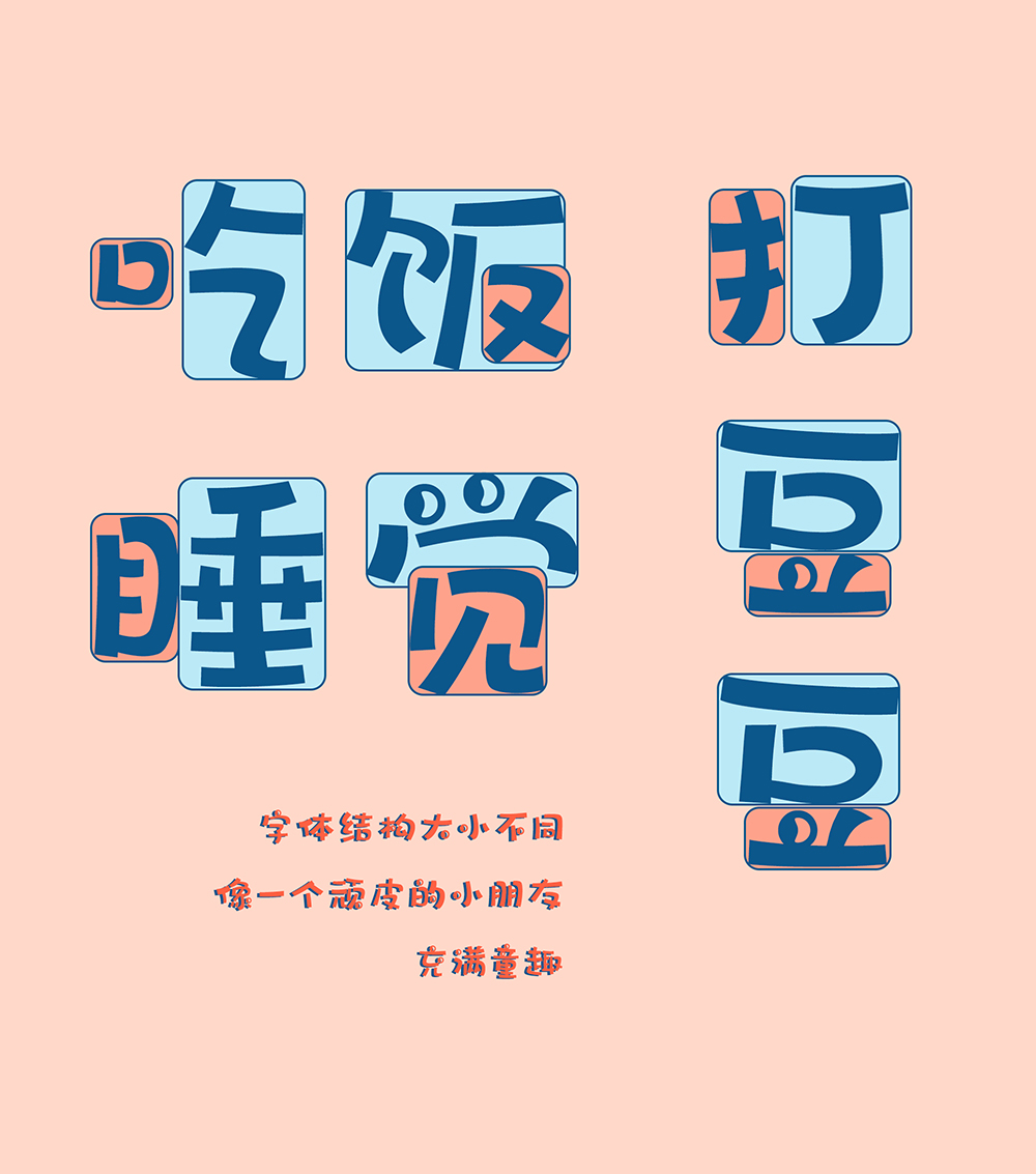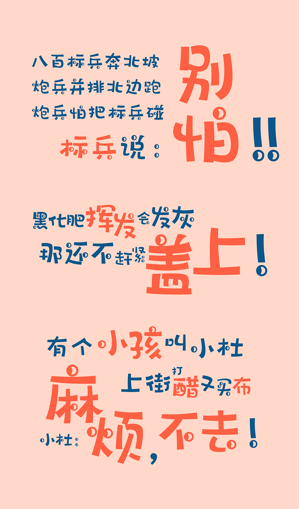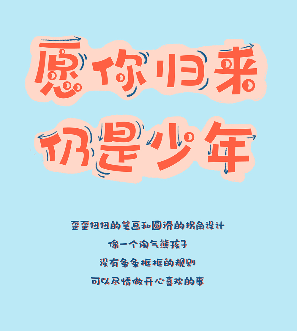 字体童趣可爱,结构多变灵动,字形活泼清新,造型生动有趣,具有灵活的适用性,天真俏皮又不失时尚感。