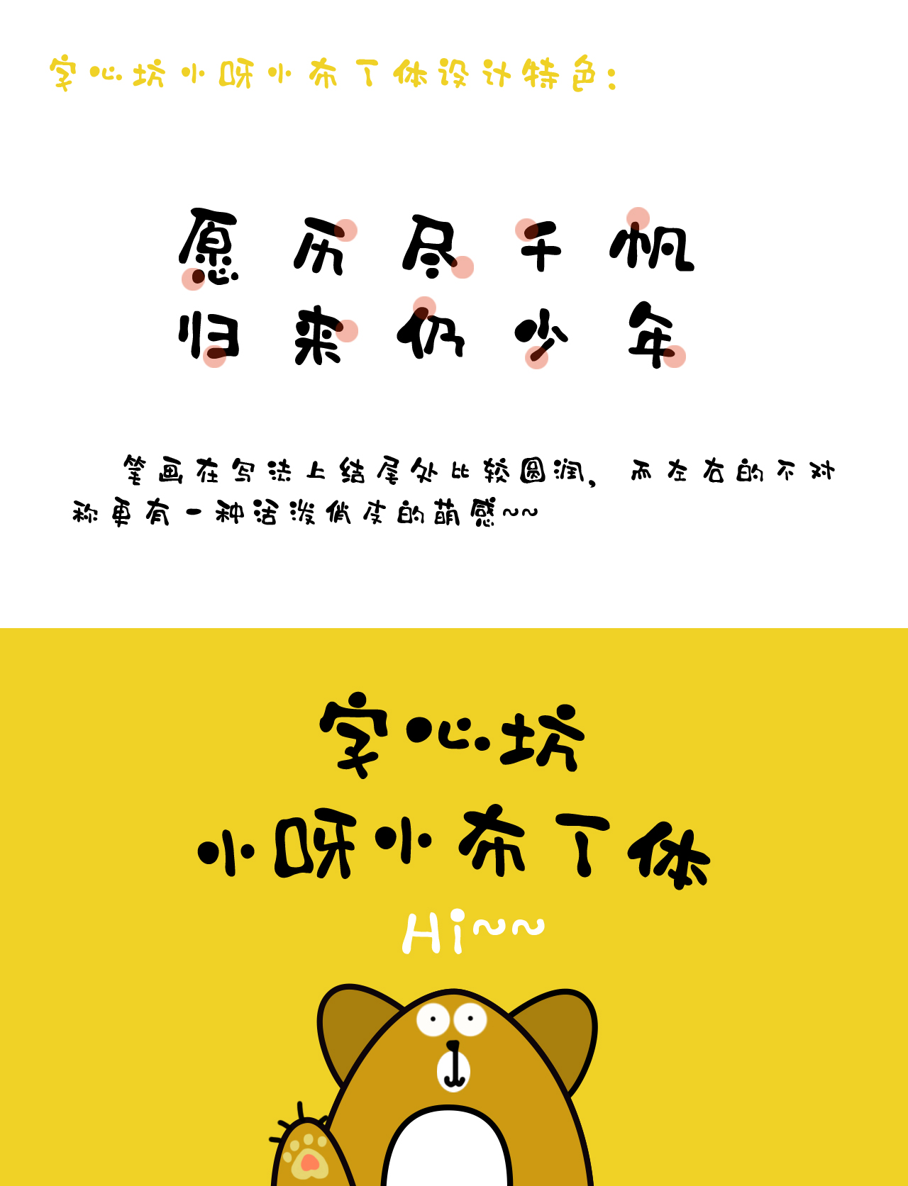 该字体由一位古灵精怪的魔法少女创作而成。前期书写过程能充分的反映出创作者心灵对于美好心境的诠释。后经电脑设计软件进行修正、编辑,最后做成计算机字库。字体风格新颖、可爱、个性、小清新、时尚、有趣,适用于标志、导视、书籍、游戏、动漫、影视、屏显等方面。