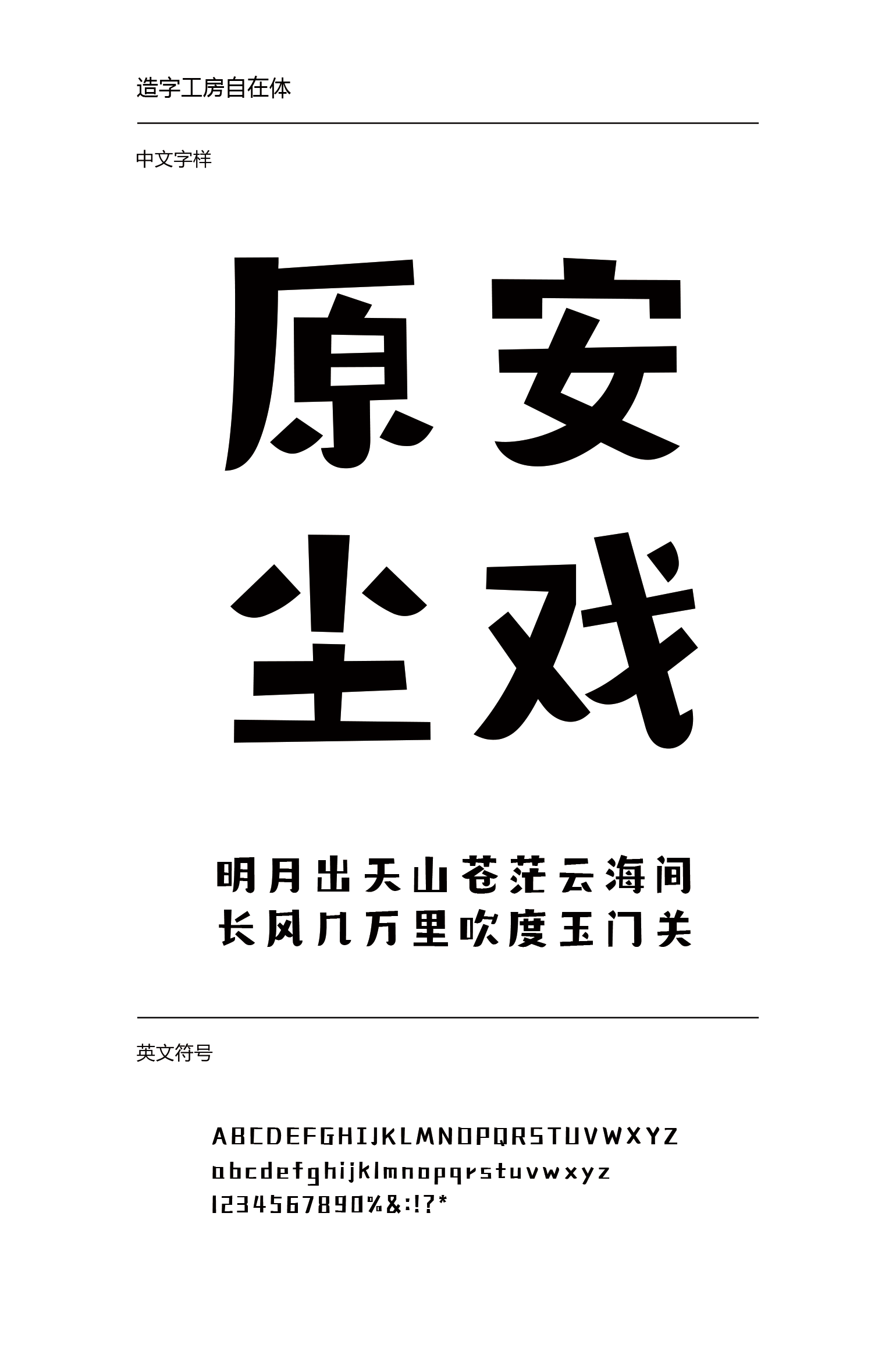 造字工房自在体其笔画特点生动,活泼俏皮,体势灵动自由,疏密有致,别具丰润。兼具文艺雅致与质朴幼拙,天真烂漫卡通可爱。此款字体适用于儿童读物、报刊杂志标题、广告设计等视觉环境,有着极强的应用空间。本字体为简体字库,采用OpenType/CID格式,Adobe-GB1-5编码。基于中华人民共和国GB2312-80字符集标准,另按需添加101个汉字。共收容字数6864CJK汉字ASCII常用字符100个。
