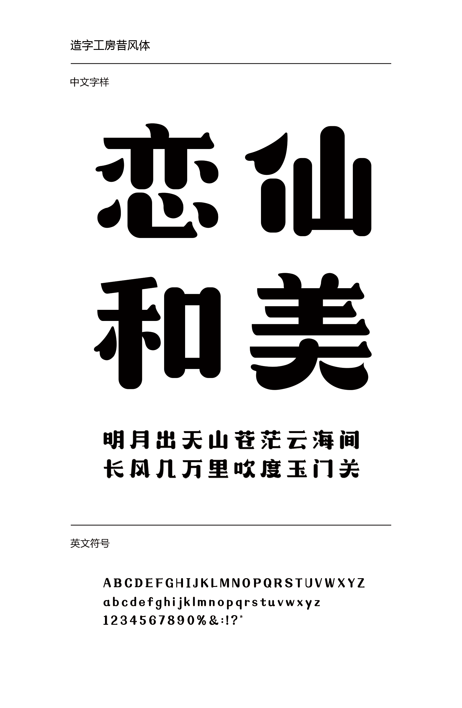 造字工房昔风体风格遒劲润雅,结构随性自由,笔势恍如飞鸿戏海,结体严紧,笔画穿插紧密、粗劲圆润、浑厚宽博,令其笔力恬润、婉畅又不失端正。适用于大标题及个性品牌设计推广等环境。本字体为简体字库,采用OpenType/CID格式,Adobe-GB1-5编码。基于中华人民共和国GB2312-80字符集标准,另按需添加101个汉字。共收容字数6864CJK汉字,ASCII常用字符100个。