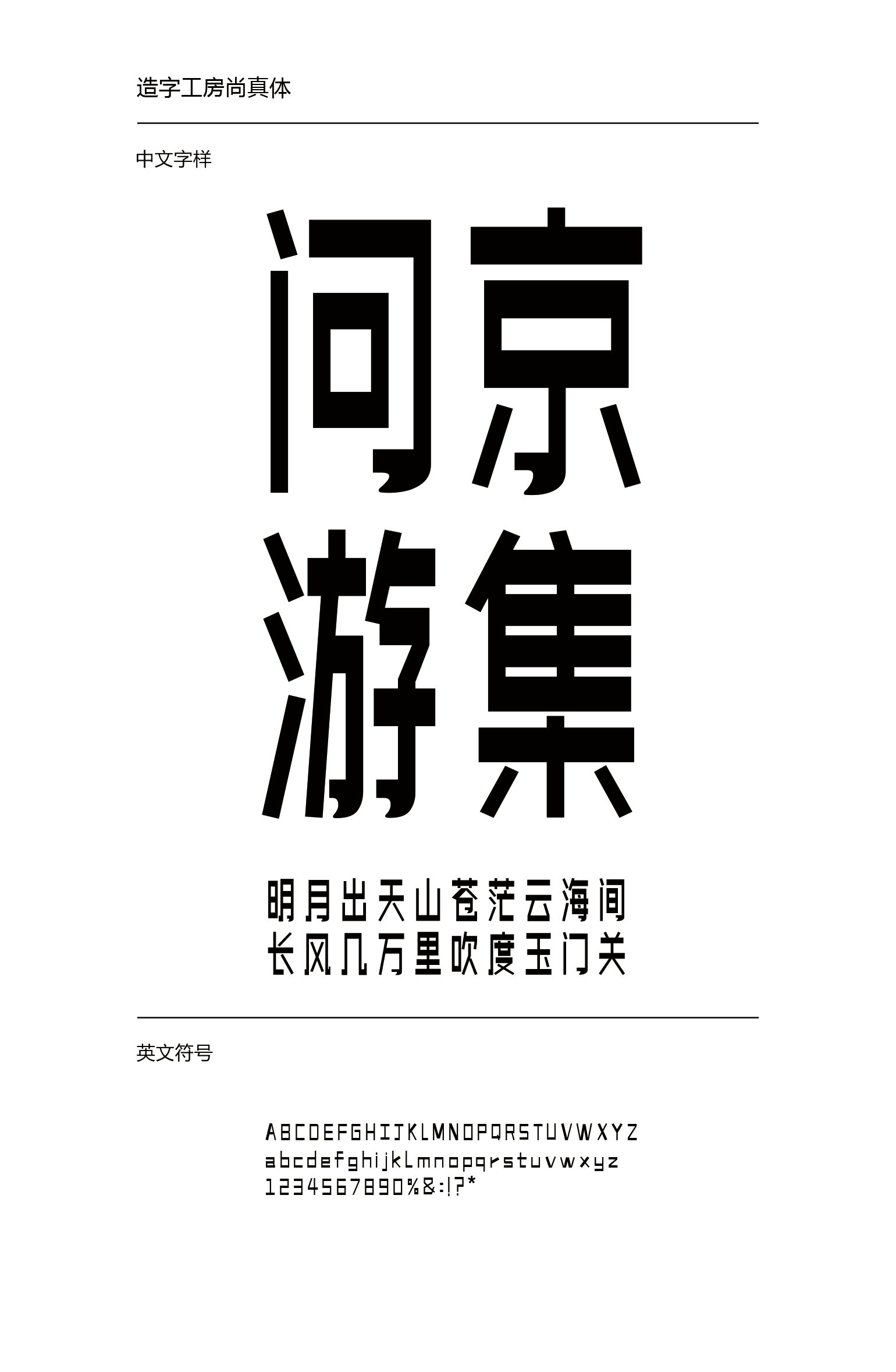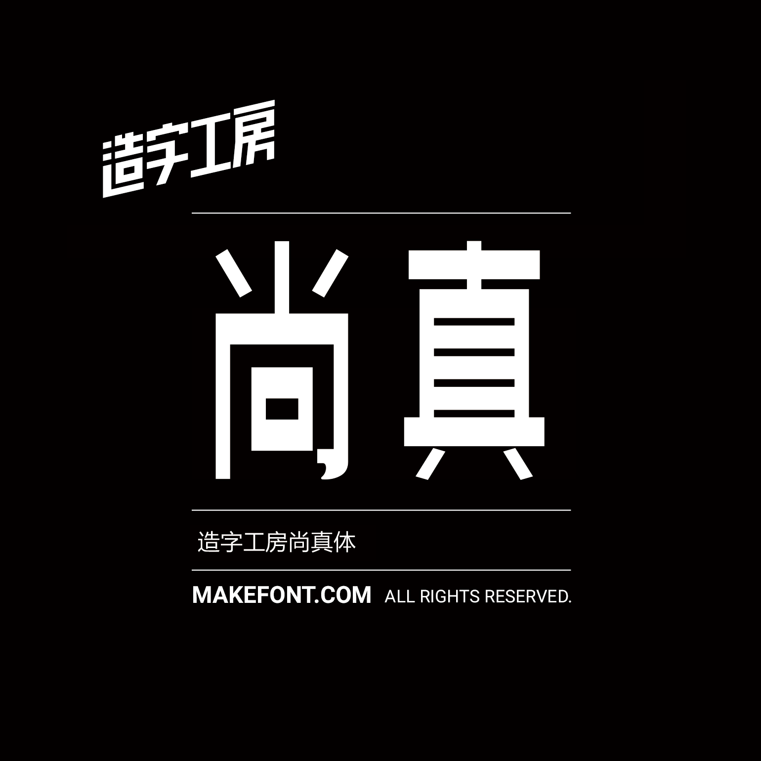 造字工房尚真体,其字瘦长、刚健质朴,结构严谨。钩画的处理令其在兼具黑体字严谨结构之外,不失灵动之感,特点鲜明。适用于大标题、品牌广告宣传等需要强力视觉表现的环境。本字体为简体字库,采用OpenType/CID格式,Adobe-GB1-5编码。基于中华人民共和国GB2312-80字符集标准,另按需添加101个汉字。共收容字数6864CJK汉字,ASCII常用字符100个。