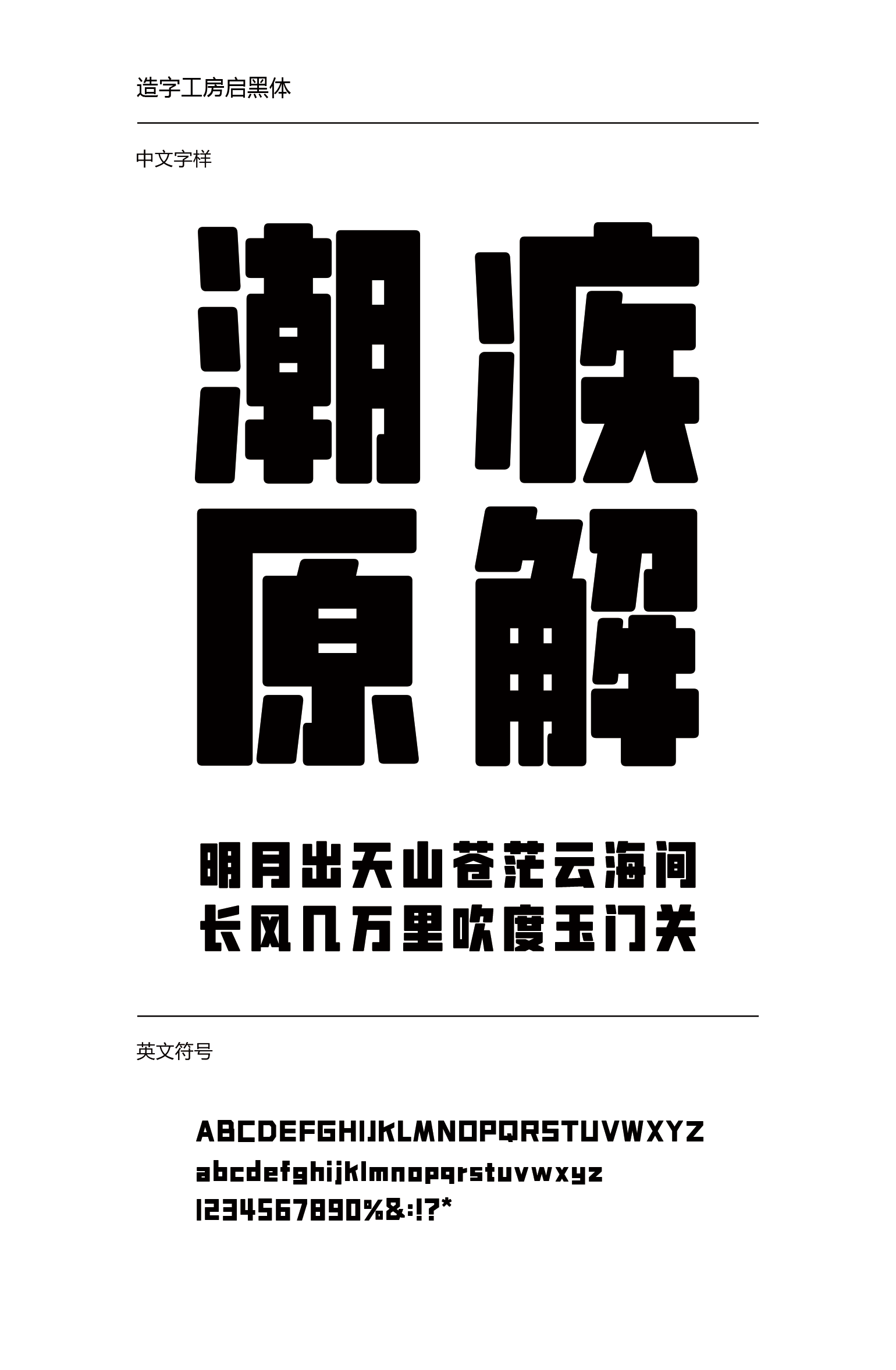 造字工房启黑体,结体疏朗简洁、工整端庄,笔触圆润、粗细均匀,风格简约流畅、刚柔并济。适用于大标题、品牌广告宣传等需要强力视觉表现的环境。本字体为简体字库,采用OpenType/CID格式,Adobe-GB1-5编码。基于中华人民共和国GB2312-80字符集标准,另按需添加101个汉字。共收容字数6864CJK汉字,ASCII常用字符100个。