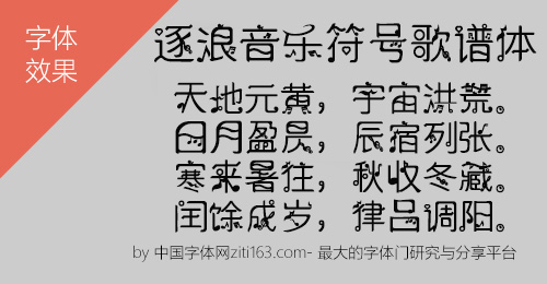 字体介绍 逐浪音乐符号歌谱体.ttf是由逐浪字库出品的一款电脑字体,也可以用于手机字体。逐浪字库Zoomla!Fonts是由北京出海软件科技有限公司专注打造的中文精...