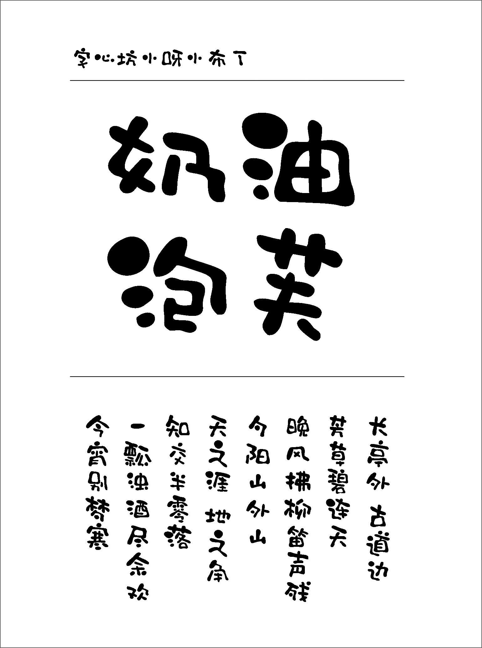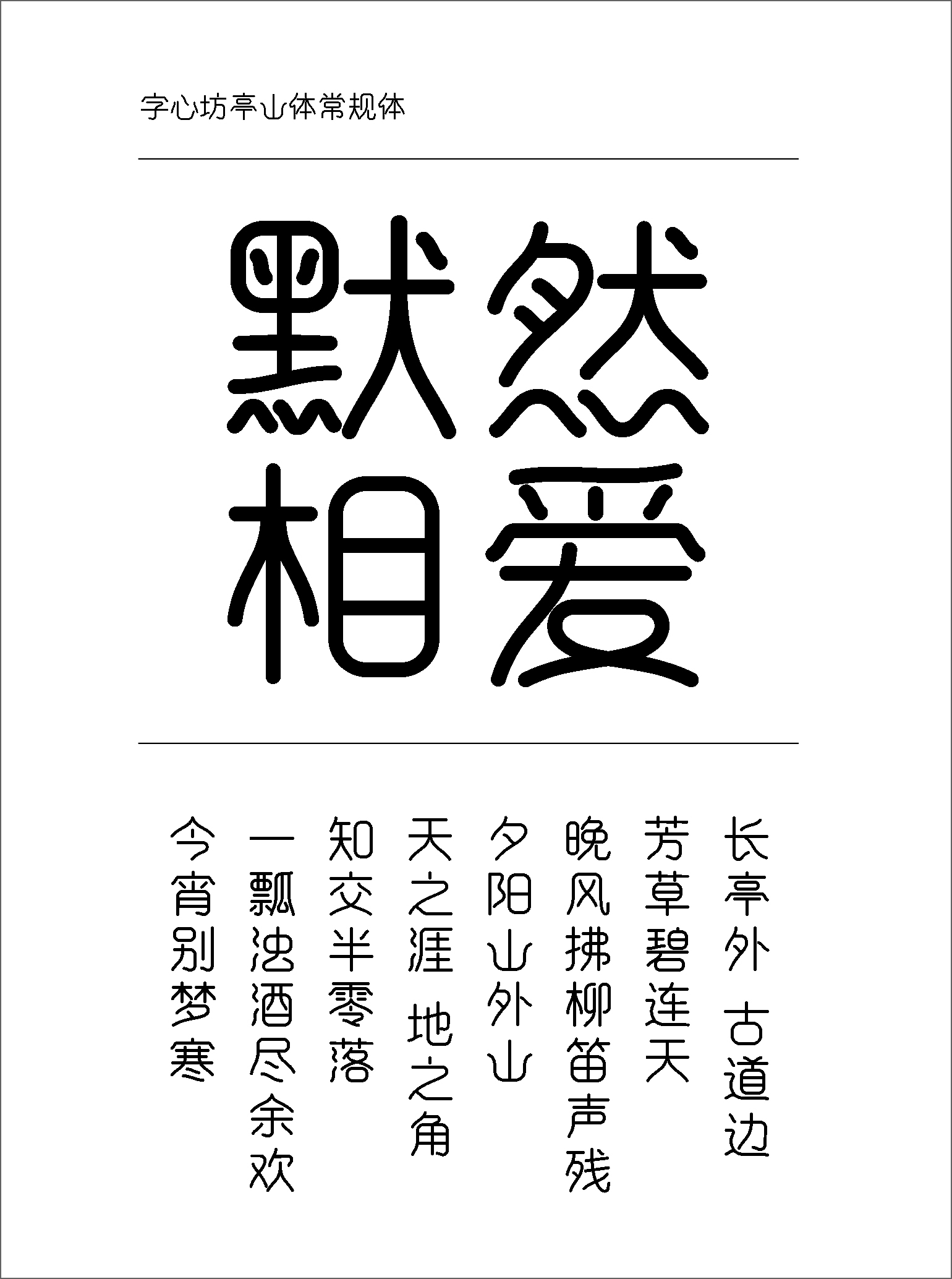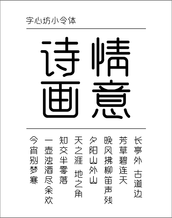 字心坊小令体 字体采用非衬线设计,字形融合中国小篆与黑体字的特点,取小篆的设计元素,同时力求精简,简化篆书,古为今用,在保证最大化识别度的基础上,...