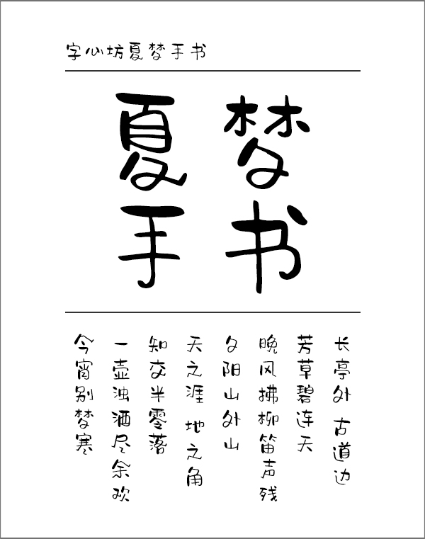 字心坊夏梦手书 该字体是采用POP字体的书写手法,用秀丽笔书写,然后扫描后通过电脑设计软件进行去杂、修正、编辑、最后做成计算机字库。字体风格新颖、个...