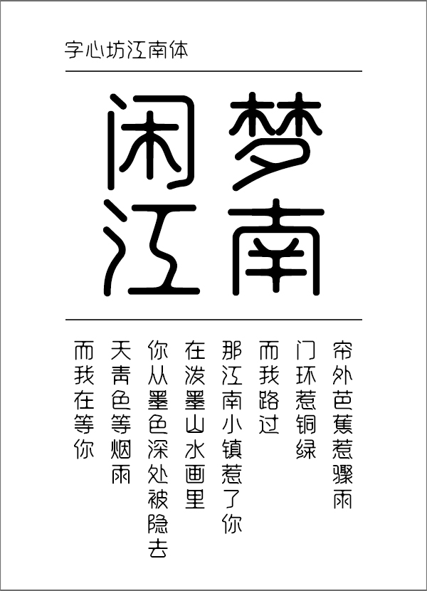 字心坊江南体 字体采用非衬线设计,字形融合中国小篆与黑体字的特点,取小篆的设计元素,同时力求精简,简化篆书,古为今用,在保证最大化识别度的基础上...