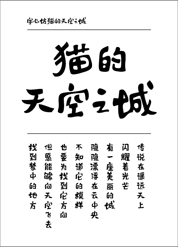 字心坊猫的天空之城 该字体由字心坊为猫的天空之城特殊定制。字心坊基于猫的天空之城LOGO的设计风格,运用猫空的设计元素逐一设计出符合国家GB2312-80字符...
