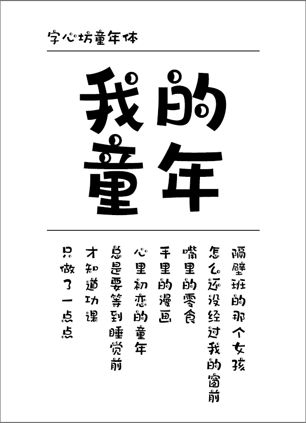 字心坊童年体 字体童趣可爱,结构多变灵动,字形活泼清新,造型生动有趣,具有灵活的适用性,天真俏皮又不失时尚感。 该字体为简体字库,采...