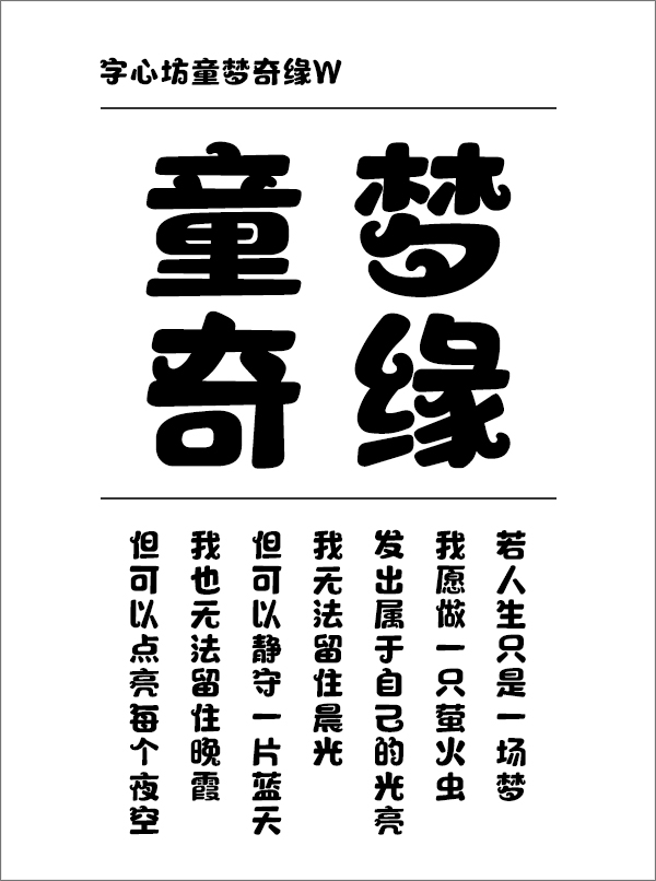 字心坊童梦奇缘W字体是一款调皮可爱的卡通字体,有灵动的俏皮感,笔画圆润,字体融入梦境般的风波卷元素,装饰味十足,充满童趣。字体个性鲜明,字形特点时尚...