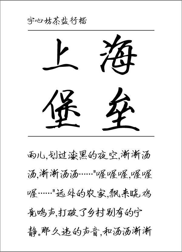 字心坊茶盐行楷 文件大小6.51MB 字符数7915 格式ttf 语言中文 英文 版本Version 2.00 March 31, 2018 字体家族:字心坊茶盐行楷 商用授权:商用需授权 文件大...