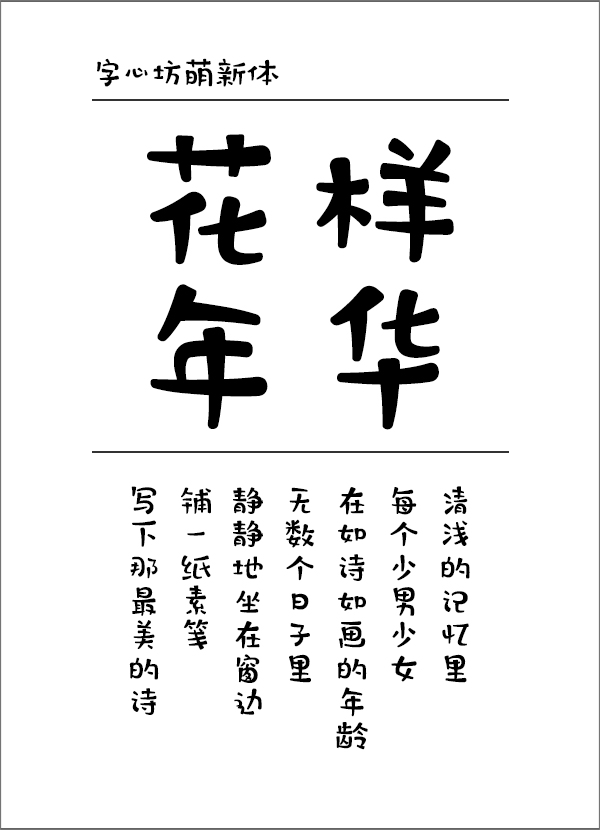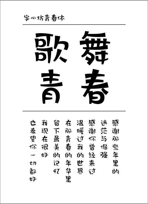 字心坊青春体 字心坊青春体字体个性鲜明,笔画粗细对比强烈,字体结构自然洒脱,字形活泼、可爱,造型生动有趣,具有灵活的适用性,婉约俏皮又不失时尚感...