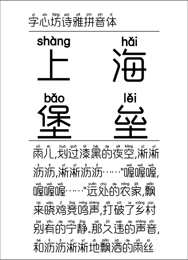 字心坊诗雅拼音体 商用需授权 字体家族字心坊诗雅拼音体 商用授权商用需授权 文件大小7.95MB PostScript名称字心坊诗雅拼音体 风格Regular 格式ttf 语言中文...