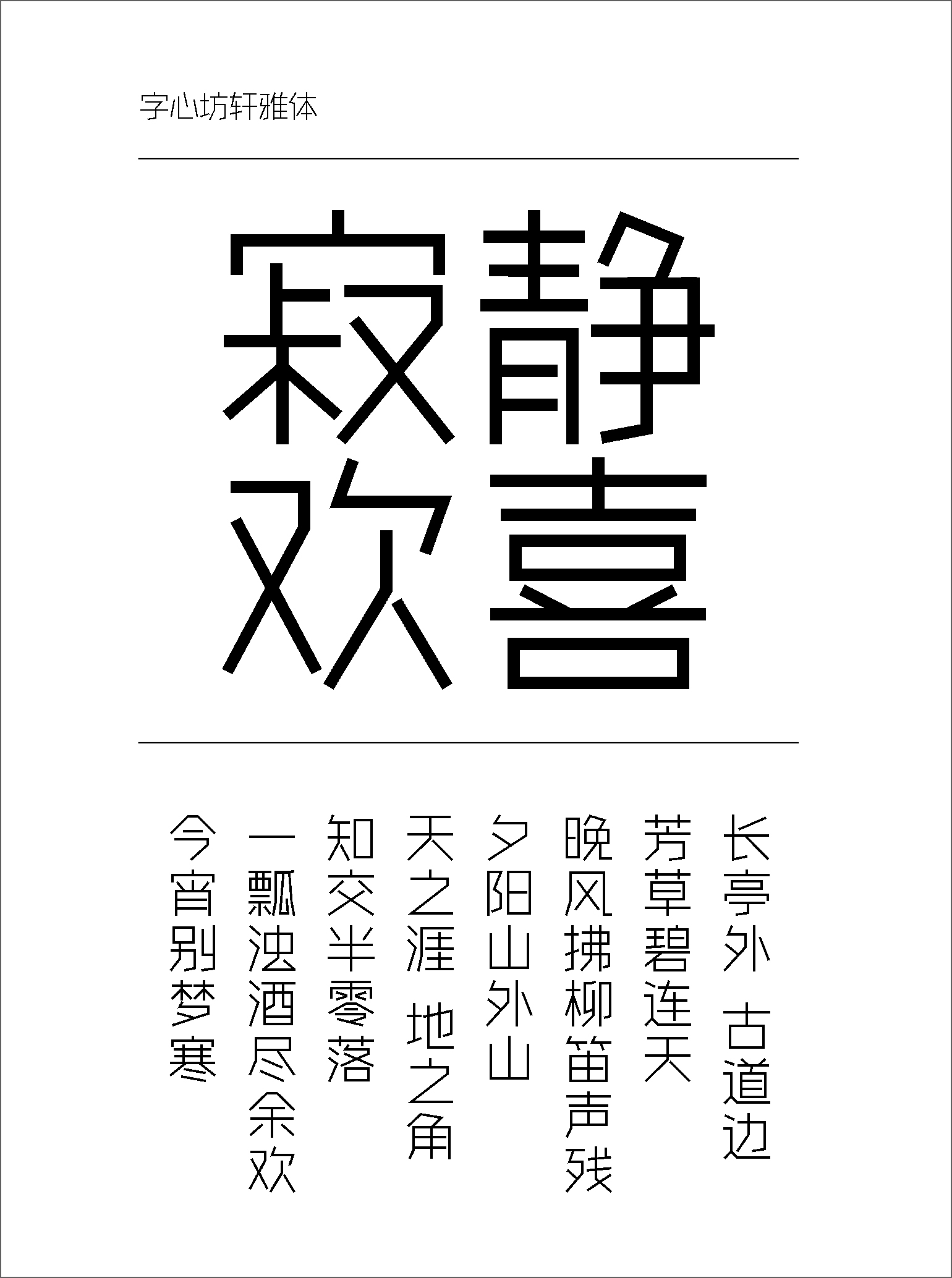 字心坊轩雅体 该字体采用非衬线设计,全部笔画采用直线设计。字体个性鲜明,字形特点时尚新颖,同时融入古风结构,灵活多变的线条造就此款字体的与众不同。...