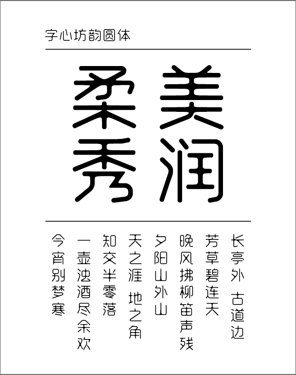 字心坊韵圆体/字心坊韵雅体 该系列字体分为字心坊韵圆体和字心坊韵雅体2款字体,字体笔画设计自然美观,字形简约,曲线优美,优雅圆润,具有较大范围的应...