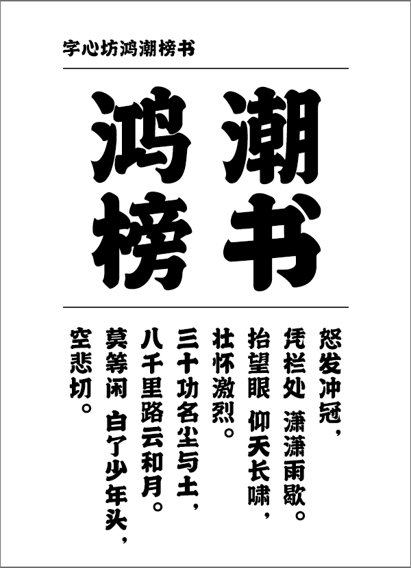 鸿潮榜书,字体融入楷书特点,字形气势磅礴,端庄大气,有力、宽厚、方正,如同巍峨的大山,充满了稳重感,同时又不失张扬的设计感。整套字体古朴浑厚,笔画...