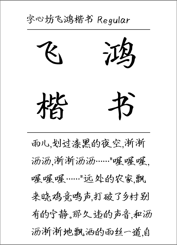 字心坊飞鸿楷书 Regular 字体家族字心坊飞鸿楷书 商用授权商用需授权 文件大小6.45MB PostScript名称ZXFFeiHongKaiShu 风格Regular 格式ttf 语言中文 英文 ...
